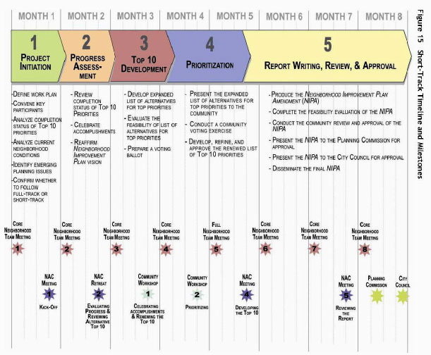 This document laid out a community process, from A to Z, which can be followed by future consultants or staff, to create a NIP Amendment. Two types of tracks were developed, depending on how thorough a given community wishes to engage in the Amendment process. The “short-track” condenses the community process to achieve a renewal of the Top 10 Action Items. The “full-track” process engages the community in a review of all action items from the original NIP, even if they were not in the Top 10. These tracks contain a detailed schedule of meetings, workshops, and retreats with a detailed time line. The short-track diagram is seen to the left. Specific methods were created for both the full-track and short-track. A system of voting on Top 10 action items was created. A matrix to document the current level of completion of action items from the original NIP documents was developed. Methods were also established on how residents can determine action item types so SNI neighborhoods can achieve a balance between capital, service, neighborhood and transformative projects. Beyond the methods regarding the community engagement process, the handbook also provides and outline of how to organize future NIP Amendment documents. The team at Public Vision Research is very proud of having participated in the development of this handbook because we saw the success of this process with FWBT community during the creation of their NIP Amendment. Click to download: Strong Neighborhood Initiative — Renewing the Action Agenda Handbook